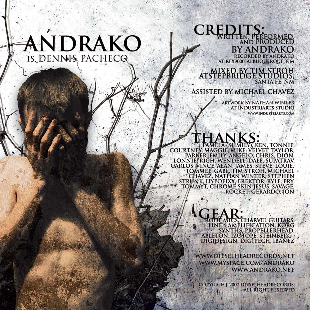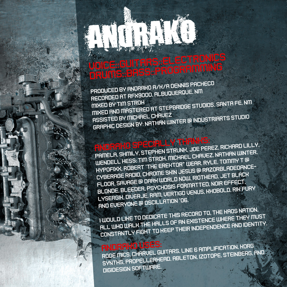 Two 4-panel digital booklets designed for Andrako’s Destruction Engine single and Mental Holokaust EP released in 2007 on Dieselhead Records. Andrako is an Industrial/Metal/Digital Hardcore recording artist and producer from the atomic badlands of New Mexico in the United States.