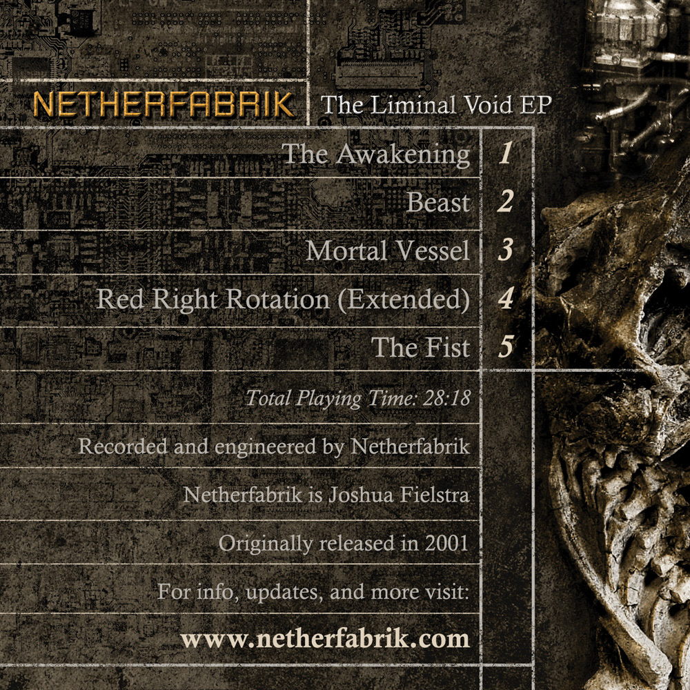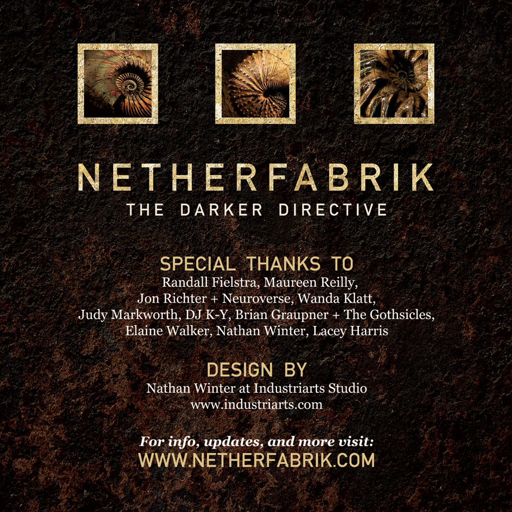 Two 3-panel digital booklets designed for Netherfabrik’s two self-released EPs, The Liminal Void and The Darker Directive. Netherfabrik is a one-man electro-industrial act originally from Milwaukee, WI but now based in Hollywood, CA consisting of sole member Joshua Fielstra. Netherfabrik's music blends a characteristic 80′s-influenced dark electro sound with epic synthetic anthems.